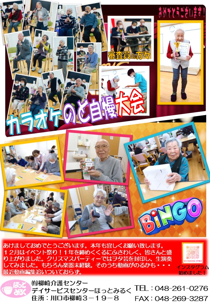 ほっとみるくNEWS 2026年1月号 2026年1月20日 最終更新日時 : 2026年1月20日 manager ほっとみるくNEWS1月号はこちら ↓↓↓ No.1No.2 12月イベント祭り!!クリスマスにカラオケのど自慢大会、ビンゴ大会!! たくさんの方々にお越しいただき、盛り上がりました!